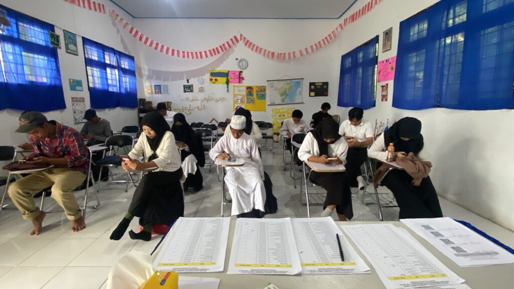 Pelaksanaan ujian berlangsung dalam suasana yang ramai, teratur, dan penuh keceriaan. Para peserta menunjukkan antusiasme yang tinggi, sementara para tutor memastikan setiap tahapan berjalan sesuai prosedur, mulai dari pembagian soal hingga proses pengawasan. Lingkungan belajar yang kondusif ini diharapkan dapat mendukung peserta dalam menunjukkan kemampuan terbaiknya.